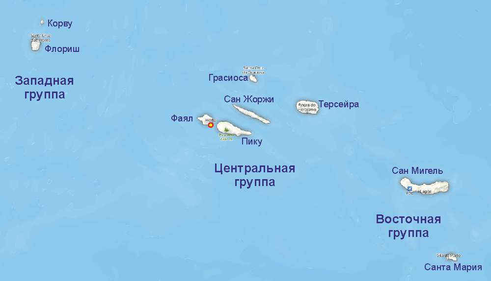 Центральная группа состоит из 5 островов расположенных довольно компактно: Фаял, Грасиоса, Терсейра, Сао Жоржи, Пику. На всех островах есть марины. На Фаяле и на Терсейре марины большие без проблем способные принять лодки более 20 метров, на Пику и Сао Жоржи марины поменьше. Следует учитывать, что на Грасиосе марина маленькая, в основном рассчитанная на местных рыбаков.