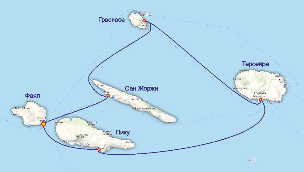 Яхтенный сезон на Азорах с мая по октябрь. Наши лодки базируются на острове Фаял в марине Орта. Марина Орта самая востребованная на Азорских островах, излюбленное место для остановки яхт идущих из Америки в Европу. На Фаяле необходимо посетить Питер БАР (Peter Cafe Sport) — знаковое место. Недельный маршрут по Центральной группе островов выглядит примерно так: Фаял — Сао Жоржи — Грасиоса — Терсейра — Пику — Фаял. Протяженность маршрута около 180 миль.